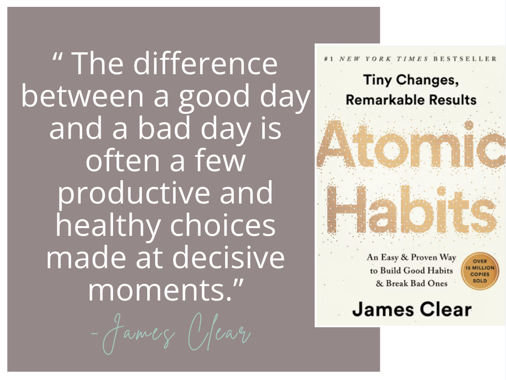 Within those daily decisive moments, we should consider all the possible outcomes of our behaviors and consider the impact of the decisions we will make. Yes, this may be easier said than done, but with habitual practice it gets easier by the day. Through behavioral change techniques, you can learn how to train your brain to think twice about your actions. It's as simple as pausing and taking a step back to analyze your thoughts and the possible consequences of the actions you desire to take. Will this action lead me closer to my goals or further away? Am I adding to the person I want to become, or am I prolonging the process? How will I feel after I take this action, will I feel good about the decision or worse? Those small decisions matter and encompass a great deal of our wellness journeys. Making small impactful decisions throughout our day is what will keep us on course, and "adds to our identity," as James Clear states in Atomic Habits.