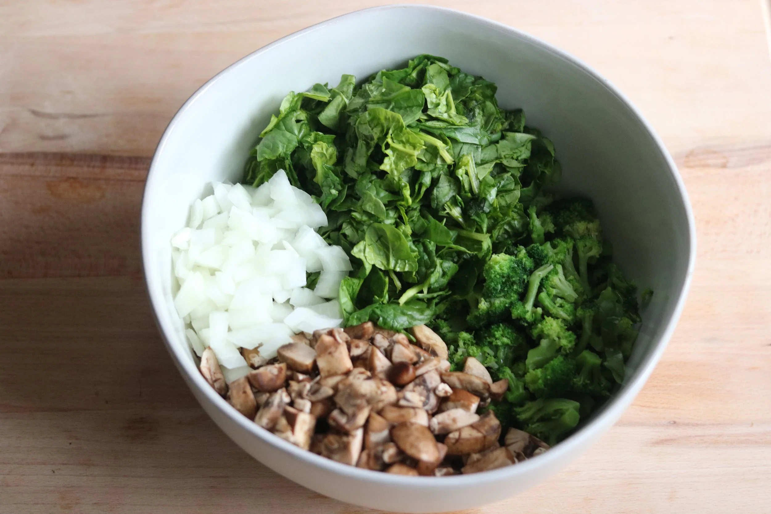 I first prep my base vegetables and add them into one large bowl. I typically stick with lower-carb and leafy green vegetables for this breakfast scramble.